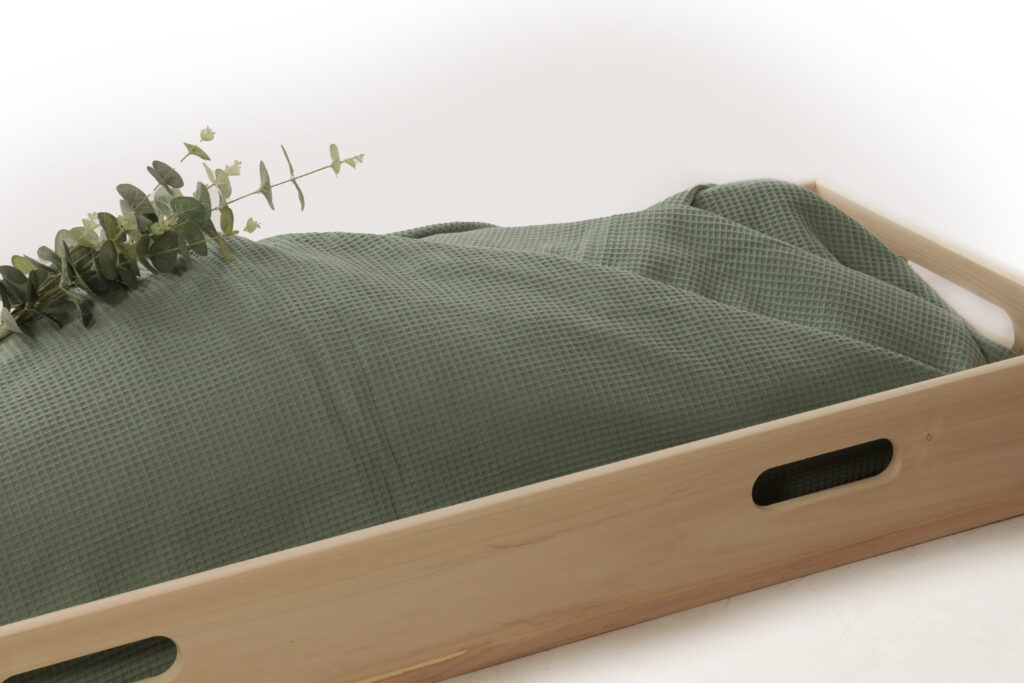 De lichtgroene lijkwade is dubbel gevoerd en bestaat uit 2 kleuren. Hierdoor kun je zelf kiezen welke kleur je gebruikt aan de buiten of binnenkant bij het opbaren en sluiten van de wade. Vouwinstructie wordt meegeleverd.